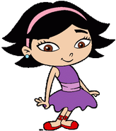 June wears a pink headband, red ballet shoes, black hair, pale skin, brown eyes, a purple tutu (ballet dress), lavander belt and sky blue earrings.