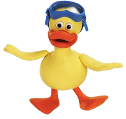 She has yellow feathers, orange webbed feet, and wears blue water goggles.